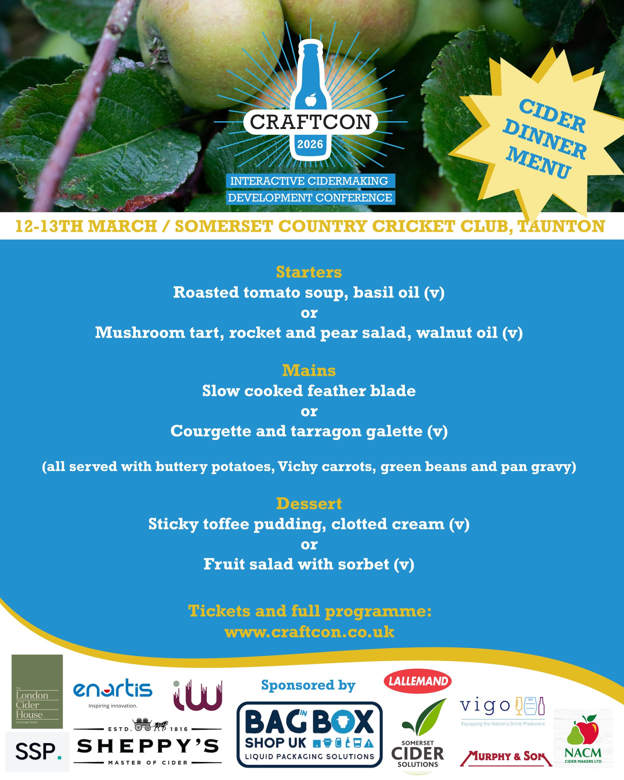 Thank you for being involved with CraftCon 2026! Please use this page to book your evening three-course dinner at which will be served after the Cider Share completes (5-7pm) at 7.30pm Thursday evening. If you have any allergies or dietary restrictions, include them in the notes box on the checkout page.